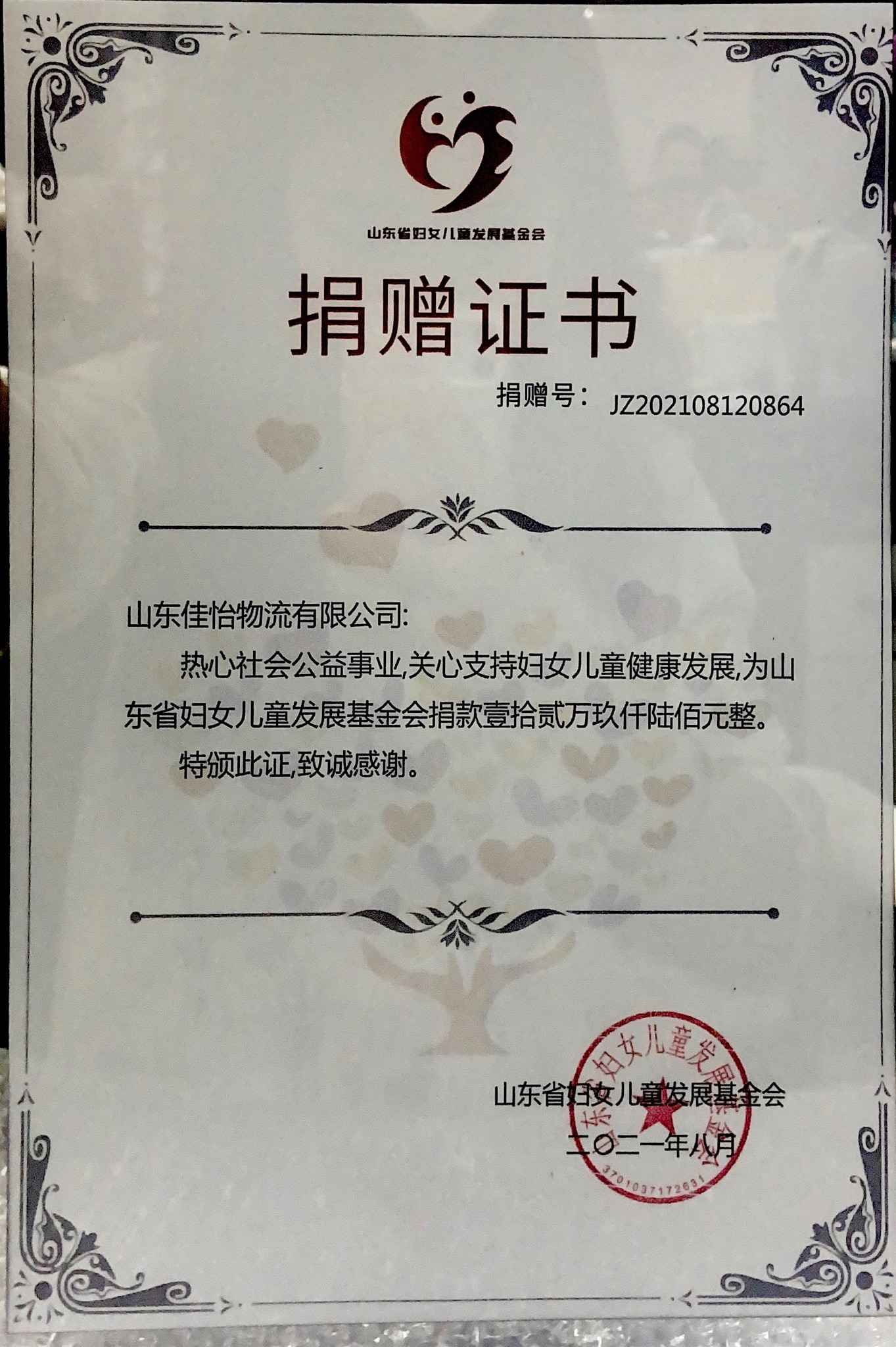 為鞏固“春蕾計劃”公益項(xiàng)目實(shí)施成果,發(fā)揮婦聯(lián)組織“聯(lián)”字優(yōu)勢,幫助更多女童繼續(xù)學(xué)業(yè)、追逐夢想,9月6日下午,山東省99公益日“春蕾計劃”聯(lián)合勸募活動在省婦聯(lián)網(wǎng)絡(luò)信息與社會服務(wù)指導(dǎo)中心啟動,活動邀請今年支援河南愛心捐贈單位參加。佳怡作為支援河南愛心捐贈企業(yè),獲得山東省婦女兒童發(fā)展基金會頒發(fā)的捐贈證書。