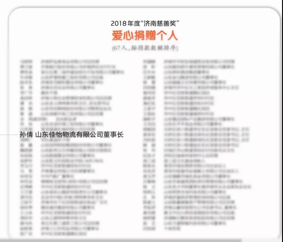 為大力弘揚(yáng)慈善精神,激發(fā)全社會(huì)支持和參與慈善的熱情,促進(jìn)濟(jì)南慈善事業(yè)持續(xù)健康發(fā)展,經(jīng)各區(qū)縣、相關(guān)單位層層推薦和科學(xué)評(píng)審確定。5月23日,愛(ài)暖泉城,濟(jì)南市慈善總會(huì)隆重表彰2018年度“濟(jì)南慈善獎(jiǎng)”先進(jìn)單位和個(gè)人。佳怡供應(yīng)鏈企業(yè)集團(tuán)董事長(zhǎng)孫倩女士榮獲“2018年度濟(jì)南慈善獎(jiǎng)愛(ài)心捐贈(zèng)個(gè)人獎(jiǎng)”。