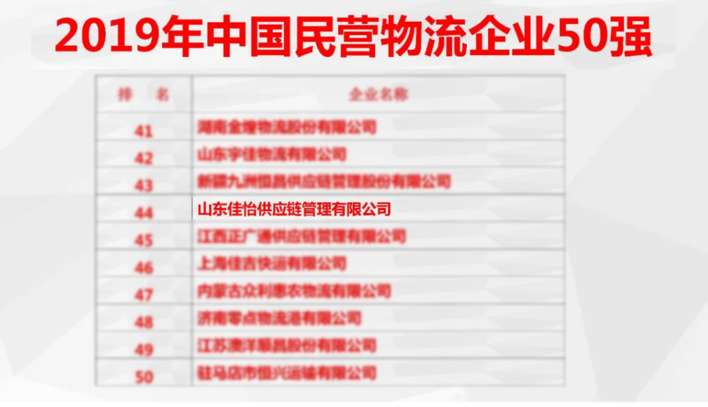 近日,中國物流與采購聯(lián)合會公布了2019年中國民營物流企業(yè)50強(qiáng)名單,佳怡供應(yīng)鏈企業(yè)集團(tuán)旗下子公司山東佳怡供應(yīng)鏈管理有限公司入選其中。
