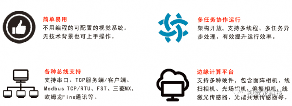 本方案采用的“龍睿AIoT”是一款低代碼、功能可視化、模塊化的視覺平臺,視覺工具拖拽式,無技術(shù)背景也可上手操作。 它包含幾千種算法,架構(gòu)開放、支持多線程多任務(wù)并行處理。龍睿擁有2D視覺、3D視覺、彩色視覺、AI深度學(xué)習(xí)視覺、視覺溯源、邊緣計算等技術(shù),可以連接各類相機(jī)和傳感器,實(shí)現(xiàn)智能制造、高端農(nóng)業(yè)、智能物流、智慧城市和智慧醫(yī)療等多領(lǐng)域應(yīng)用場景。